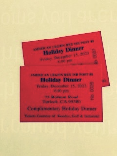 Holiday dinner, two free tickets to the first members that show up in person at a meeting or on Friday night .