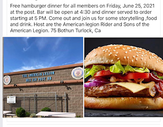 Free hamburger dinner for all members on Friday, June 25, 2021 at the post.